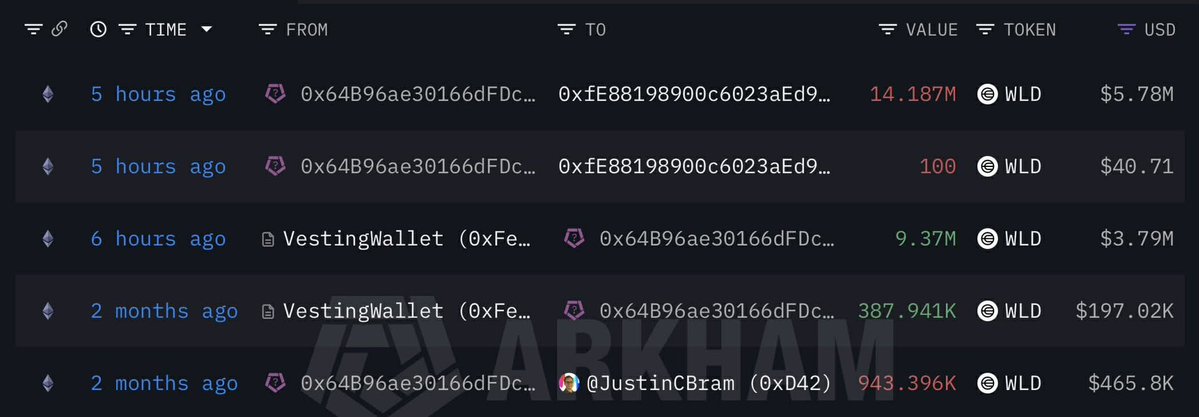 Five hours ago, a wallet (possibly belonging to @JustinCBram) deposited 14.18 million WLD (approximately $5.78 million) into #Binance. Currently, his wallet still holds 4.82 million WLD (approximately $1.94 million). Address: