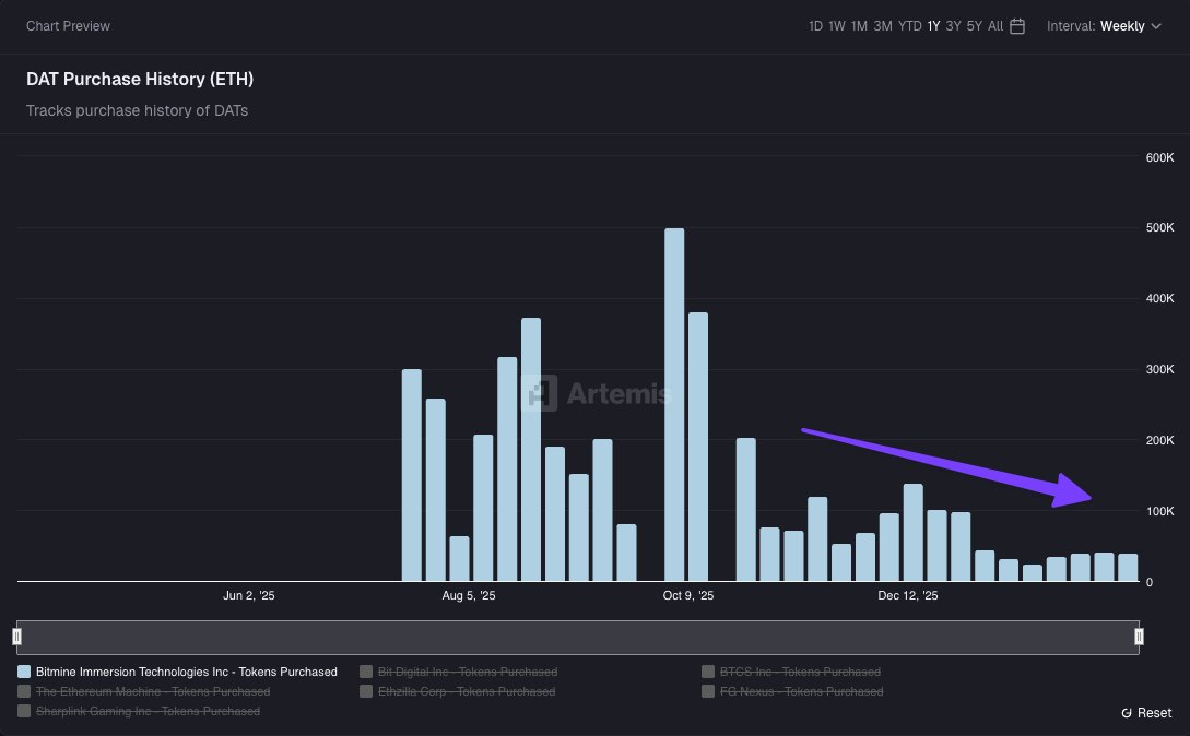 $BMNR is rewriting Saylor DAT's investment strategy in its own way. A closer look at the data reveals stark contrasts: 2025: An average of 101,600 ETH were purchased per week. 2026 to present: An average of 37,100 ETH were purchased per week. Despite holding $670 million in cash on its balance sheet, the price of ETH has fallen, meaning its accumulation has decreased by 63%. $BMNR is moving away from a purely accumulation model, investing $200 million in Beast Industries and participating in Worldcoin's investment through EightCo. This marks a transformation for DAT 2.0: no longer confined to the "5% alchemy," but investing in the ecosystem that makes the Ethereum network indispensable.