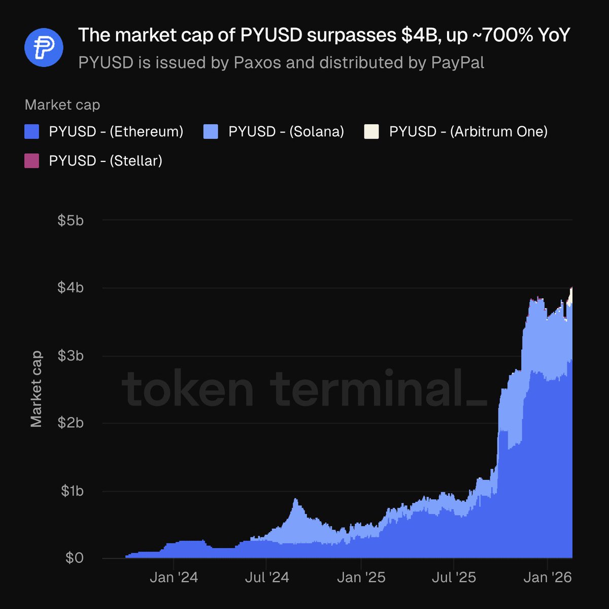 🚨⛓️ Breaking News: PYUSD's market capitalization has surpassed $4 billion, a year-on-year increase of approximately 700%. PYUSD is issued by @Paxos and distributed by @PayPal. See the image below 👇