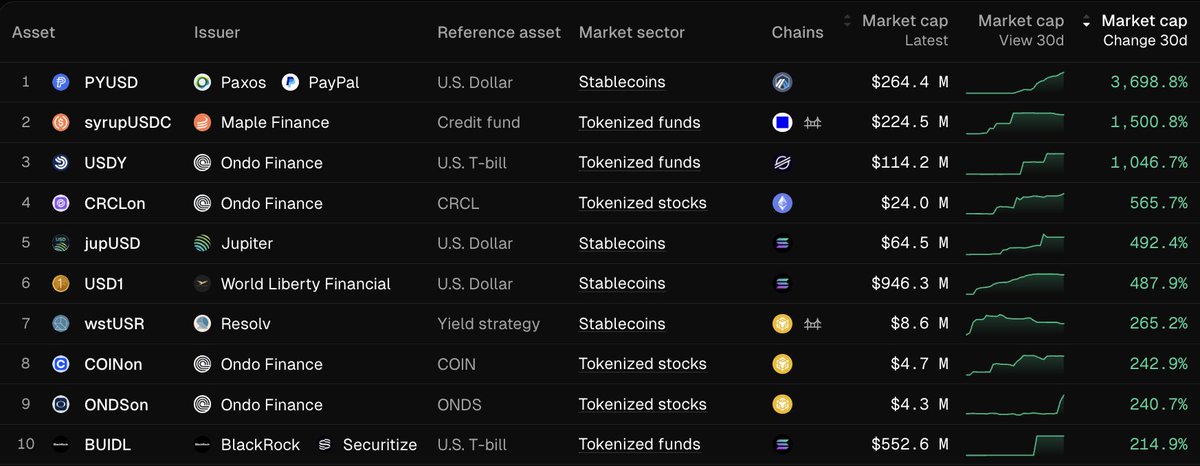 Top 10 Fastest Growing RWA Deployments: 1. PYUSD on @arbitrum 2. syrupUSDC on @base 3. USDY on @StellarOrg 4. CRCLon on @ethereum 5. jupUSD on @solana 6. USD1 on Solana 7. wstUSR on @BNBCHAIN 8. COINon on BNB Chain 9. ONDSon on BNB Chain 10. BUIDL on Solana