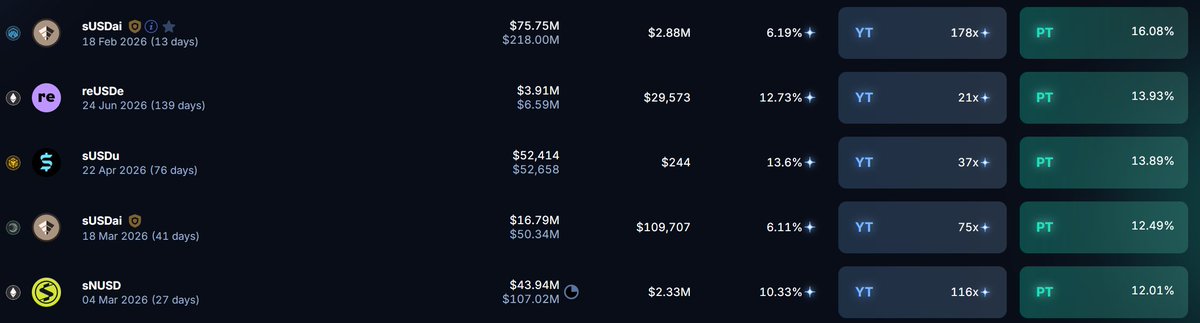 Top 5 Stablecoins with the Highest Yields on Pendle Fi Platform 1) sUSDai: 16% Yield, 13-day Term ► Introduction: @USDai_Official's GPU-collateralized stablecoin, currently over 99% backed by Treasury bonds. ► Opportunity: It would be better if its maturity wasn't so short. If I wanted exposure, I would choose the 41-day term (12.4% yield). 2) reUSDe: 14% Yield, 129-day Term ► Introduction: reUSDe is @re's "performance" token, and can be seen as a secondary component of Re in some ways. The yield comes from reinsurance, but Re also has an institutional component (Re Capital). As I understand it, even before reUSDe, Re Capital would have absorbed approximately $70 million in initial losses. ► Opportunity: The 140-day yield looks quite good, especially if there is indeed a lower-tier "share" to absorb potential initial losses. 3) sUSDu: 13.6%, 76 days ► Information: sUSDu from @UnitasLabs uses a delta-neutral strategy with JLP to collect funds and JLP yields. ► Opportunity: Extremely low liquidity, so it may not be worthwhile for most people. That said, JLP has consistently underperformed, so this could be an opportunity to short yields. 4) sUSDai, mentioned again, but with a 41-day term. 5) sNUSD: 12%, 27 days ► Information: sNUSD is @Neutrl's staked asset, backed by a basket of stablecoin yields, but focused on over-the-counter trading, meaning the asset is purchased at the spot price and hedged during the vesting period. Solvency is currently fully transparent, and transparency regarding stablecoin strategies should improve soon. ► Opportunity: I personally like this, but as a Neutrl ambassador, I may be biased. The biggest drawback is that it only lasts 27 days, but if you frequently use short-term time points to reduce the risk of duration issues, it's a good option.