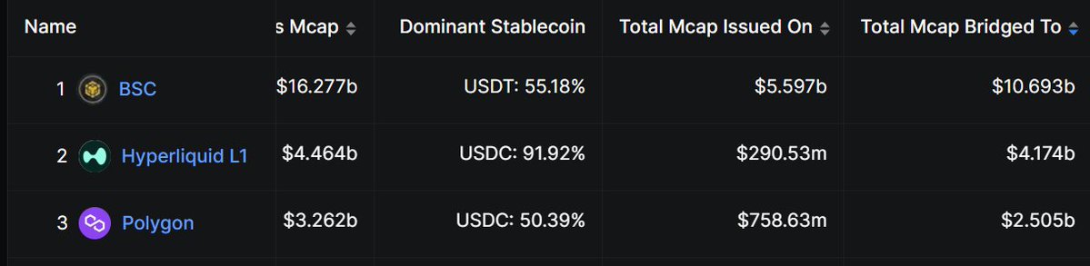 Ranking by Stablecoin Supply: 1/ @ethereum 51.61% 2/ @trondao 27.89% 3/ @BNBCHAIN 5.27% (Highest total bridged market capitalization, reaching $10.693 billion) @ethereum @trondao @BNBCHAIN 1/ Ethereum accounts for more than half of the global stablecoin supply, reaching 51.61%, highlighting its position as a major settlement layer for DeFi and payments. Tron's 27.89% share reflects Tether's (USDT) heavy reliance on its low-fee network for retail transactions. @ethereum @trondao @BNBCHAIN 2/ BSC ranks third in stablecoin supply, accounting for 5.27%, but its highest bridged market capitalization, reaching $10.693 billion, indicates strong cross-chain liquidity, enhancing its utility in arbitrage and multi-chain strategies. @ethereum @trondao @BNBCHAIN 3/ Data shows that emerging L1 tokens like Hyperliquid (bridging transaction volume of $4.174 billion) are gaining momentum thanks to USDC's dominance (91.92%), which may foreshadow a shift in high-speed transactions to other blockchains. @ethereum @trondao @BNBCHAIN 4/ I personally believe that Ethereum's application prospects will change significantly, from trading/holding to "everyday money," and then to payments and savings. McKinsey points out that Ethereum's annual transaction volume is $27 trillion, but this is still less than 1% of the total global transfer volume. I believe that once the Clarity Act is passed, this number could easily double.