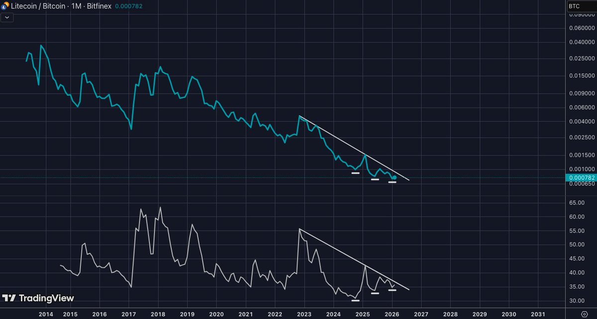 Litecoin/Bitcoin Monthly Chart (including Relative Strength Index RSI) Classic bullish divergence 👀 Imminent reversal?