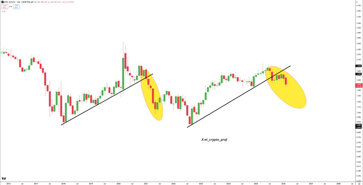 #Altcoins Friendly reminder: Did you know? The chart for $BTC.D/LTC looks almost exactly the same as it did in 2020/2021. Back then, a three-year trendline broke downwards, marking the start of an altcoin uptrend. Now, we're seeing the same thing again. 👀
