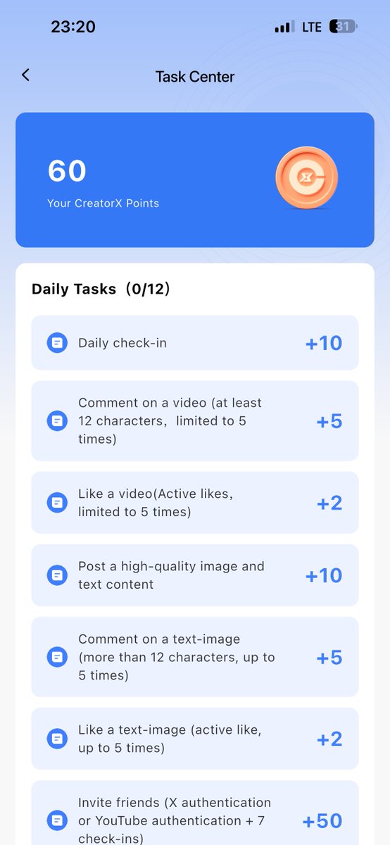 Daily tasks are one of @CXInc_Official's most unique features. You earn points for each task completed, which can be redeemed for airdrop rewards. I have a lot of fun with CreatorX. I can watch videos, participate in interactions, and easily earn money at the same time. It's a social networking app with real rewards. You can use this link to get the app;