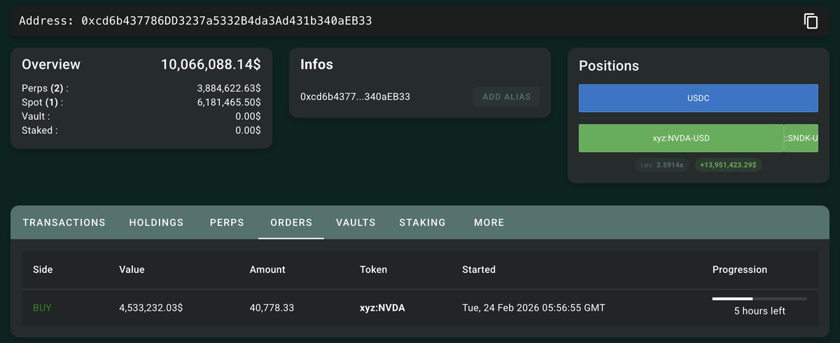 User 0xcd6b deposited 7.35 million USDC into the Hyperliquid platform to go long on Nvidia (NVDA) and SNDK stocks. He currently holds a long position of 61,951 Nvidia (NVDA) shares (worth $11.94 million) and a long position of 2,920 SNDK shares (worth $2 million), with an additional 40,778 Nvidia (NVDA) limit orders pending execution (worth $4.53 million).
