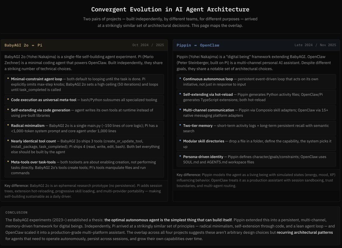 If you look at what I'm playing with—you might be able to guess what's coming next. The following frameworks have many similarities: 👶babyagi2o ('24) <-> 🥧pi (the underlying framework of OpenClaw) 🦄pippin framework ('24) <-> 🦞openclaw