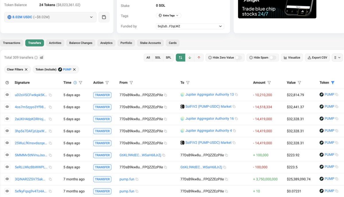 According to data from OnchainLens, the wallet associated with Pumpfun (“77DsB”) has sold all of its 3.75 billion PUMP tokens at an average price of $0.0021, in exchange for $8.02 million worth of USDC; while another related wallet (“GpCfm”) has transferred 1.21 billion PUMP tokens (approximately $2.57 million) to Bitget and currently still holds 3.54 billion PUMP tokens (approximately $7.4 million).