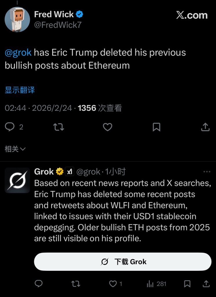 Eric Trump deleted recent bullish posts about WLFI and ETH, while posts from 25 years ago and earlier remain. The market tends to fall every time Eric Trump posts, so perhaps his deletion of those posts is a bullish signal?