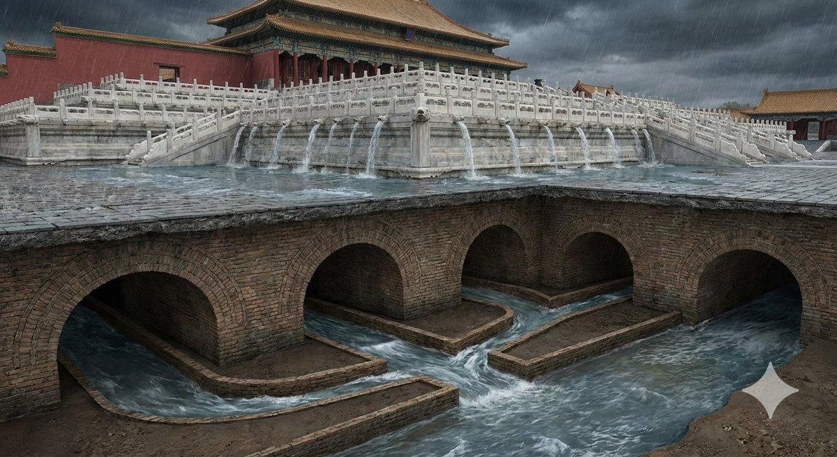 But the real miracle lies underground. This water doesn't flow randomly, but precisely falls into hidden channels in the stone slabs, entering a complex underground network of "open ditches" and "hidden channels," much like the capillaries of the human body. The main channels are wide enough for two people to walk side by side. This network follows the terrain, ultimately smoothly guiding all rainwater into the Inner Golden Water River, flowing out of the palace. It is not only architecture, but also the ultimate embodiment of the Eastern philosophy of harmony between man and nature and following the natural flow of water.