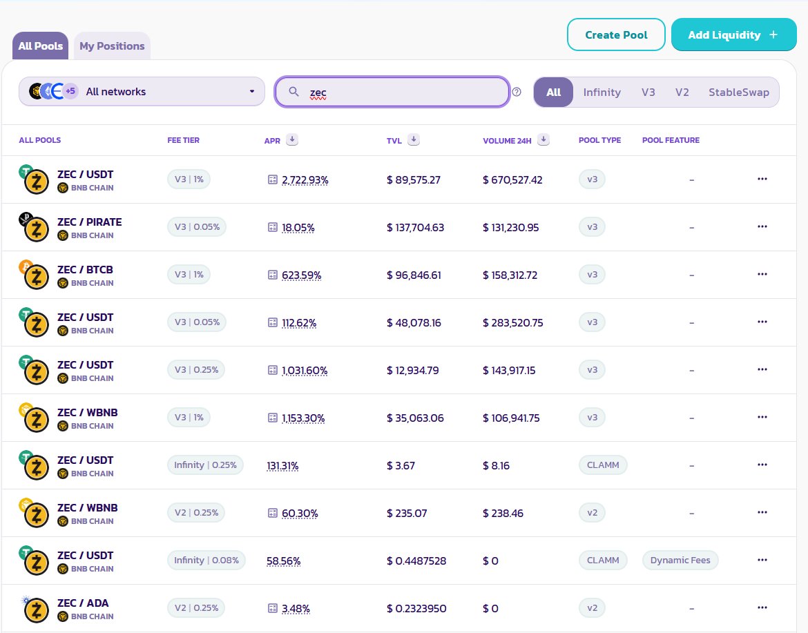 Why choose between $ZEC and $BTC when you can stake ZEC/BTCB on PCS at 600% APY? Of course, the liquidity is only 100,000, and I'm only half joking, because IL is real, and 90% of miners don't recommend using CLP.