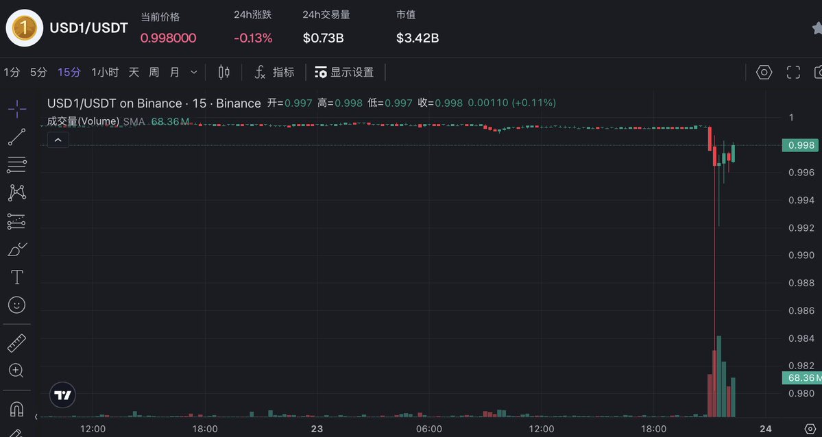 📉Trump's second son deletes retweet of WLFI @worldlibertyfi tweet, causing $WLFI to briefly drop over 8% and $USD1 to briefly de-peg to 0.98 Monitoring shows that Eric Trump, co-founder of World Liberty Financial and Trump's second son, deleted a retweet of a tweet from the official WLFI Twitter account announcing "More #USD1 trading pairs will be listed on Binance @binance". Possibly affected by this action, WLFI briefly dropped over 8%, currently trading at $0.111. The USD stablecoin USD1 briefly de-peg to 0.9802 USDT, currently trading at 0.9966 USDT. However, Eric Trump's (@EricTrump) profile still includes the official World Liberty Financial Twitter account, and he hasn't deleted many of his previous World Liberty Financial-related tweets.