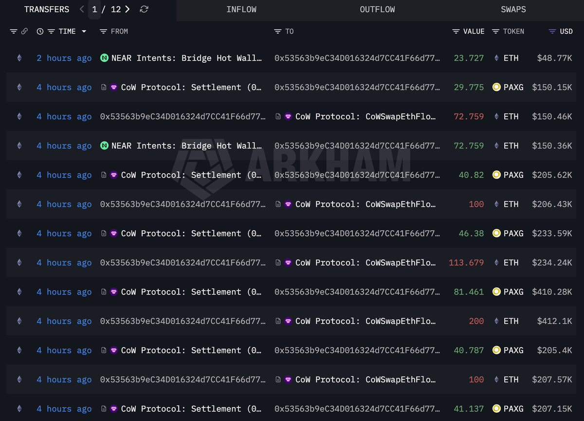 A mysterious whale is converting Ethereum ($ETH) into gold. Over the past four days, it has bridged 9,180 ETH (worth $18.6 million) through NEAR Intents and exchanged 9,156 of them (worth $18.54 million) for 3,734 PAXG (worth $18.54 million).