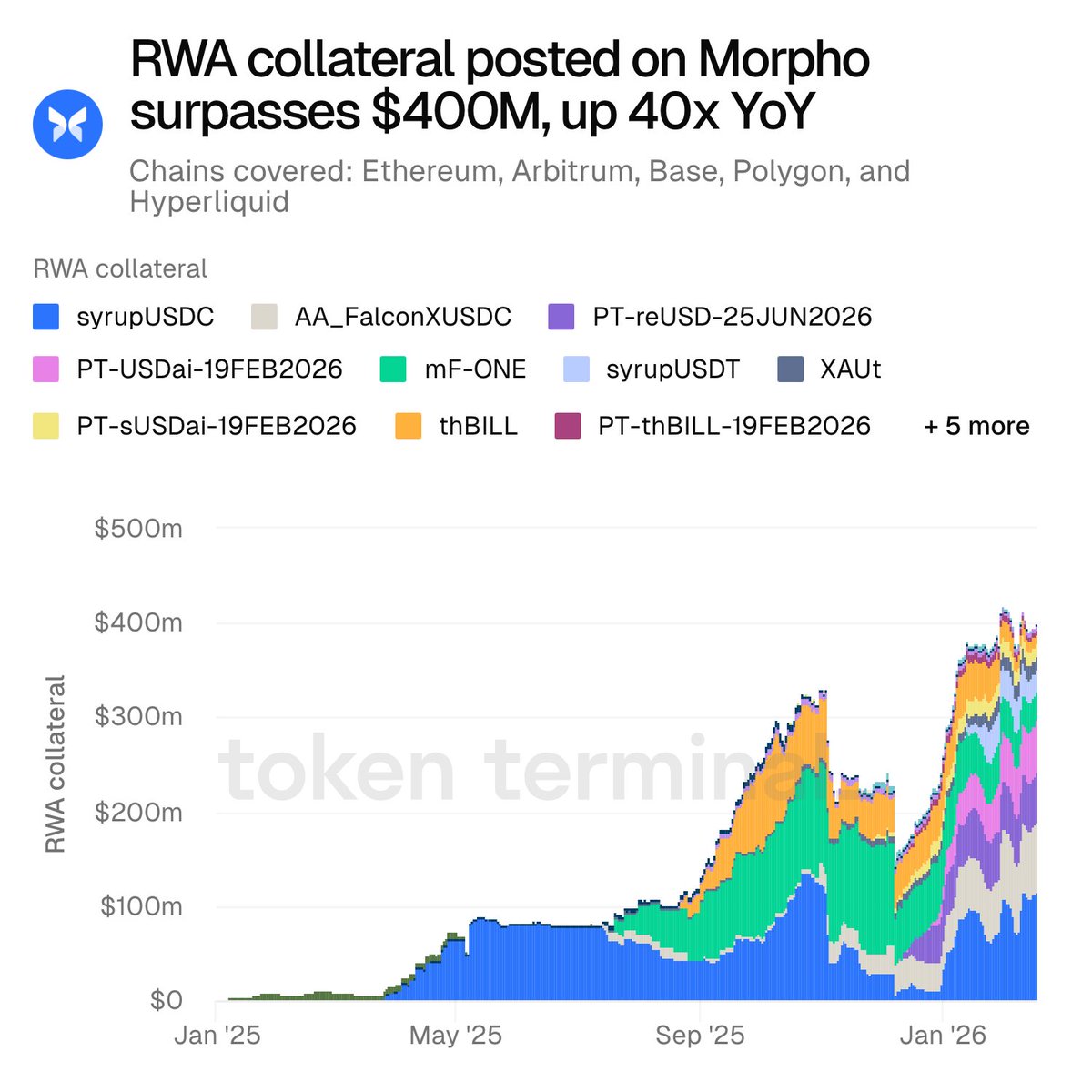 🌎🦋 RWA collateral on the @Morpho platform has surpassed $400 million, a 40-fold increase year-over-year. This market has grown from zero to $400 million in less than 12 months. The following charts are for your reference 👇 Collection Exposure: 💳 Private Placement Credit: syrupUSDC, syrupUSDT @maplefinance AA_FalconXUSDC @paretocredit PT-USDai-19FEB2026*, PT-sUSDai-19FEB2026*, sUSDai @USDai_Official mF-ONE @MidasRWA 🛡️ Insurance: PT-reUSD-25JUN2026*, reUSD @re 🪙 Commodities: XAUt @tether PAXG @Paxos 🏦 Treasury Bonds: thBILL, PT-thBILL-19FEB2026* @Theo_Network EUTBL @Spiko_finance ⚖️ Market Neutral: USCC @SuperstateInc *Approved @pendle_fi