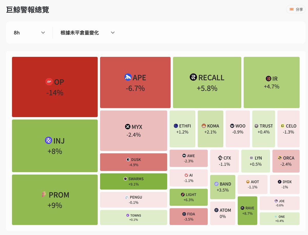 Today, gold (PAXG) and the entertainment sector performed relatively well, but the overall market remained unsatisfactory... Tokens showing clear short-term whale-like movements include OP, INJ, PROM, and APE, which are worth keeping an eye on! To observe whale-like movements, visit: