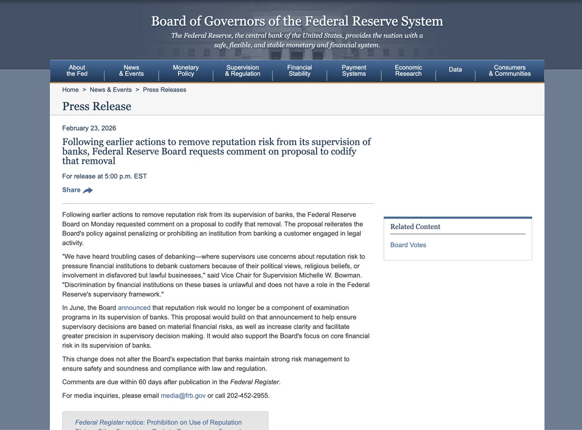 The Federal Reserve issued new guidance to eliminate "reputational risk." "Following previous steps to remove reputational risk from banking supervision, the Federal Reserve Board of Governors on Monday solicited comments on a proposal to formalize this removal into law. The proposal reaffirms the Board's policy that a customer should not be penalized or barred from continuing to serve a customer because of their legitimate activities." "We have heard of some disturbing cases of 'closed-account' transactions—regulators using reputational risk concerns to pressure financial institutions to close customers' accounts because of their political views, religious beliefs, or involvement in unpopular but legitimate business," said Michelle W. Bowman, Vice Chair for Supervision. "Discrimination by financial institutions based on these grounds is illegal and inconsistent with the Federal Reserve's regulatory framework." "In June, the Board announced that reputational risk would no longer be part of its banking supervision review program. This proposal will build on that, further ensuring that regulatory decisions are based on substantial financial risk and improving the transparency and accuracy of regulatory decisions. It will also support the Board's greater focus on core financial risk in banking supervision."