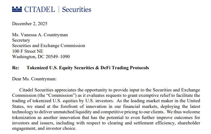 • Citadel pressed the SEC for tighter oversight on DeFi platforms trading tokenized securities, citing unequal rules.