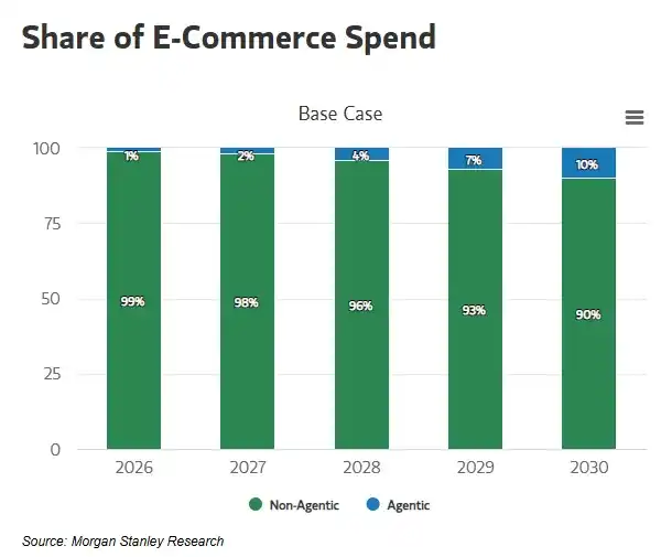 Morgan Stanley predicts that by 2030, Agentic Commerce will drive U.S. e-commerce spending to $190 billion to $385 billion, representing a market penetration rate of 10%–20%.